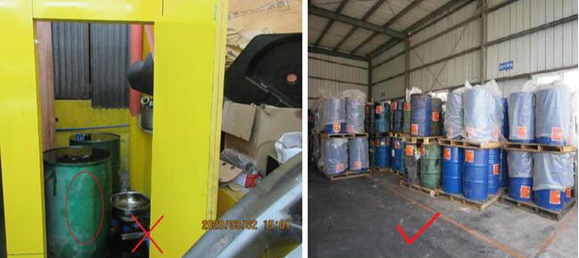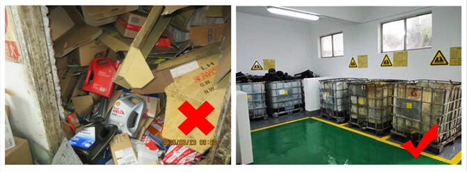 (錯誤)危廢(廢機油桶)和非危廢紙皮一起存放 (正確)危廢按種類分類存放,分區(qū)貯存,且不同類廢物間有明顯間隔(如過道等),地面硬化處理防滲漏