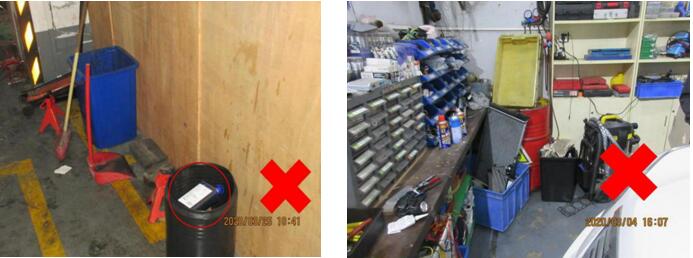 (錯誤)危廢(廢機油桶)丟棄于垃圾桶,涉嫌非法傾倒危險廢物 (錯誤)廢機油桶未設(shè)危廢標簽,無防滲漏措施,貯存場所未圍蔽