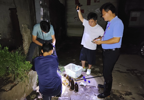 檢查組采取“四不兩直”方式,先后巡查橋南街草河工業(yè)區(qū)和陳涌工業(yè)區(qū)的部分生產(chǎn)企業(yè),并察看上述2個工業(yè)區(qū)內(nèi)部管網(wǎng)。當晚20時40分許,檢察組巡查至陳涌工業(yè)區(qū)內(nèi)陳涌東五巷10號門前時,發(fā)現(xiàn)有一雨水收集井異常,有白色污水排出至工業(yè)區(qū)內(nèi)合流管網(wǎng)。經(jīng)排查溯源后鎖定,位于橋南街陳涌東五巷10號二樓存在一家無證照印花廠正在偷偷生產(chǎn),其清洗網(wǎng)板廢水用排水管(塑膠小管)偷排至廁所后,經(jīng)化糞池排入至路面雨水觀察井,最后流入陳涌東五巷合流管網(wǎng),經(jīng)合流管排入市政污水管網(wǎng)。