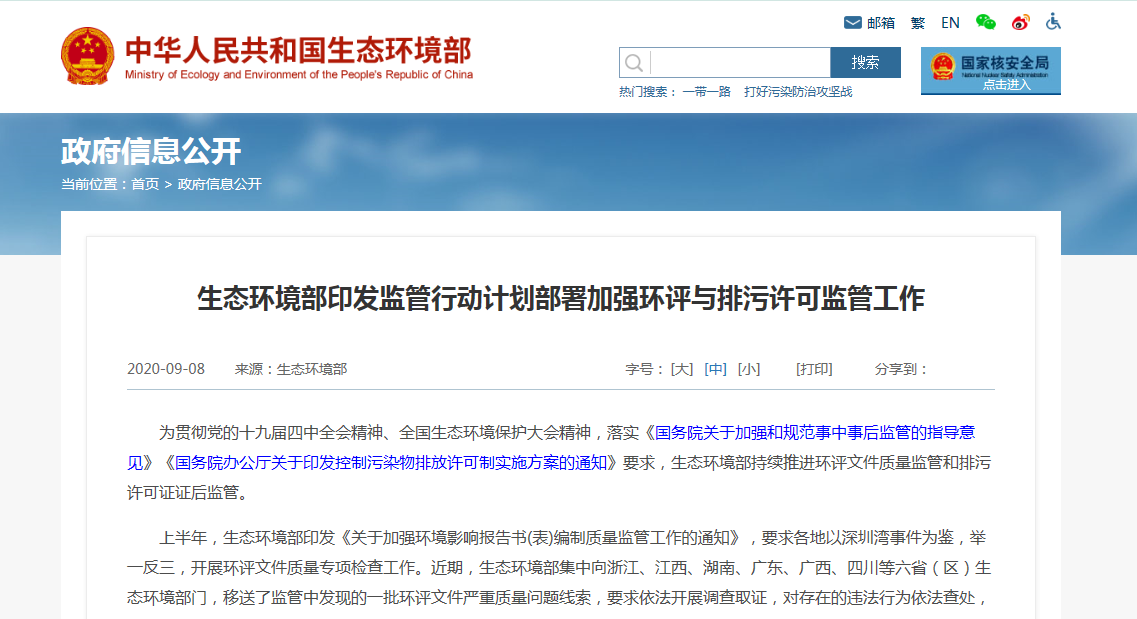 為貫徹黨的十九屆四中全會(huì)精神、全國(guó)生態(tài)環(huán)境保護(hù)大會(huì)精神,落實(shí)《國(guó)務(wù)院關(guān)于加強(qiáng)和規(guī)范事中事后監(jiān)管的指導(dǎo)意見(jiàn)》《國(guó)務(wù)院辦公廳關(guān)于印發(fā)控制污染物排放許可制實(shí)施方案的通知》要求,生態(tài)環(huán)境部持續(xù)推進(jìn)環(huán)評(píng)文件質(zhì)量監(jiān)管和排污許可證證后監(jiān)管。