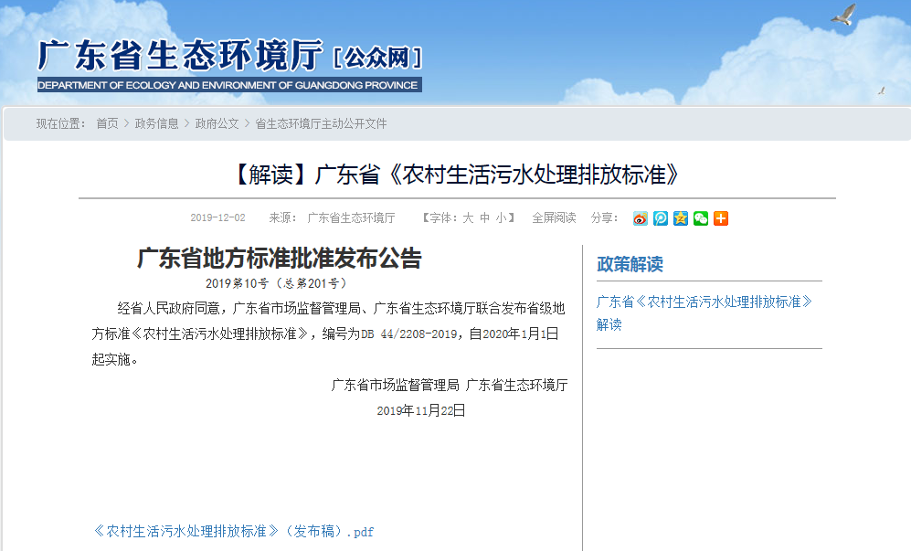 12月2日,廣東省生態(tài)環(huán)境廳發(fā)布了我省首個(gè)《農(nóng)村生活污水處理排放標(biāo)準(zhǔn)》,新建農(nóng)村生活污水處理設(shè)施水污染物排放設(shè)施從2020年1月1日起執(zhí)行本標(biāo)準(zhǔn),現(xiàn)有農(nóng)村生活污水處理設(shè)施水污染物排放設(shè)施自2020年7月1日起執(zhí)行本標(biāo)準(zhǔn)。
