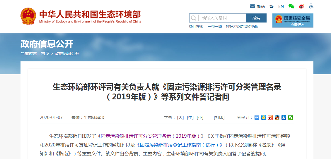 生態(tài)環(huán)境部近日印發(fā)了《固定污染源排污許可分類管理名錄(2019年版)》《關(guān)于做好固定污染源排污許可清理整頓和2020年排污許可發(fā)證登記工作的通知》以及《固定污染源排污登記工作指南(試行)》(以下分別簡稱《名錄》《通知》和《指南》)等重要文件。就文件出臺背景、主要內(nèi)容,生態(tài)環(huán)境部環(huán)評司有關(guān)負(fù)責(zé)人回答了記者的提問。