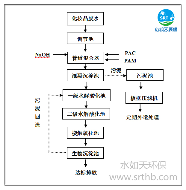 廢水首先統(tǒng)一排入調(diào)節(jié)池進行隔油隔渣及水質(zhì)水量的均化作用,然后經(jīng)過污水提升泵抽上混凝沉淀池,廢水進入沉淀池過程中,先加入NaOH溶液,將pH值調(diào)到8左右,然后再加入PAC溶液,最后加入PAM藥劑,經(jīng)過管道混合器的混合均勻后,進入混凝沉淀池與廢水一起反應(yīng)。當廢水在流經(jīng)沉淀沉速加大,實現(xiàn)固液分離?;炷恋沓爻鏊魅胨馑峄兀诖罅克饧毦?、酸化菌作用下將不溶性有機物水解為溶解性有機物,將難生物降解的大分子物質(zhì)轉(zhuǎn)化為易生物降解的小分子物質(zhì),從而改善廢水的可生化性。水解酸化池出水進入接觸氧化池再流入斜管沉淀池,它既可以高效地進行固液分離,得到直接使用的穩(wěn)定中水,又可在生物池內(nèi)維持高濃度的微生物量,工藝剩余污泥少,極有效地去除氨氮,出水懸浮物和濁度接近于零。(如需了解更多詳情歡迎致電:姚工:13926003430)