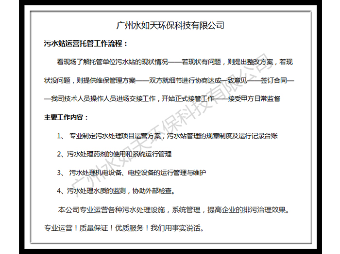 廣州水如天環(huán)保專業(yè)運營各種污水處理設施,系統(tǒng)管理,提高企業(yè)的排污治理效果。專業(yè)運營!質量保證!優(yōu)質服務!我們用事實說話。歡迎來電咨詢,姚工:13926003430
